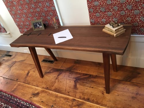 Live Edge Writing Desk / A wide slab of cut wood, sanded and finished with the bark edge left.